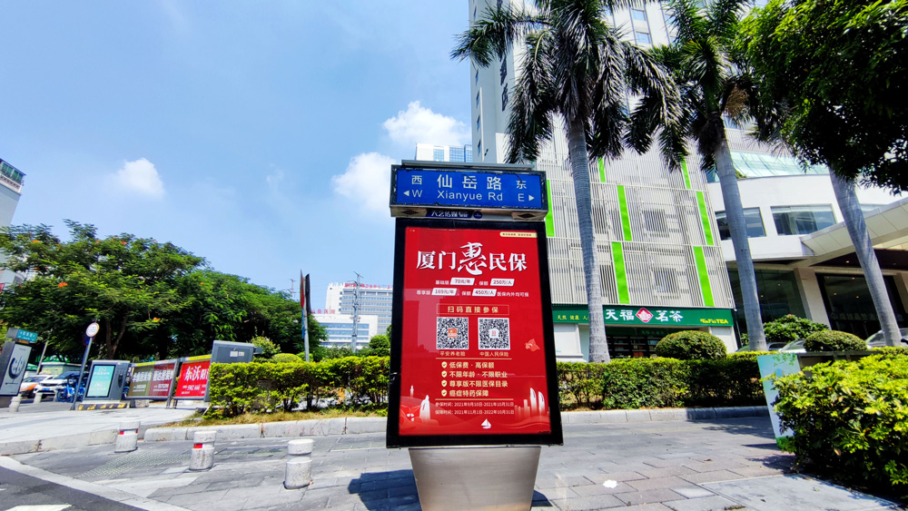 目前“惠民保”在全廈門市島內(nèi)外各個(gè)主干道及主干道交叉口、黃金的人流車流途徑處、居民生活住宅區(qū)等路段投放多個(gè)城市路名牌、公交車候車亭。
